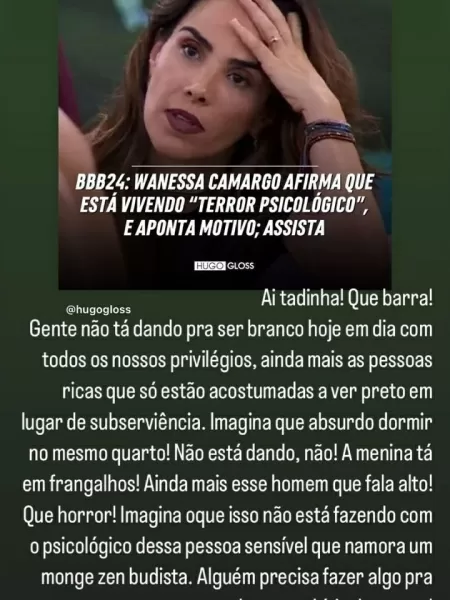 “Ai, tadinha! Que barra! Gente, não tá dando pra ser branco hoje em dia com todos os nossos privilégios, ainda mais as pessoas ricas que só estão acostumadas a ver preto em lugar de subserviência. Imagina que absurdo dormir no mesmo quarto! Não está dando, não! A menina tá em frangalhos!”, começou.