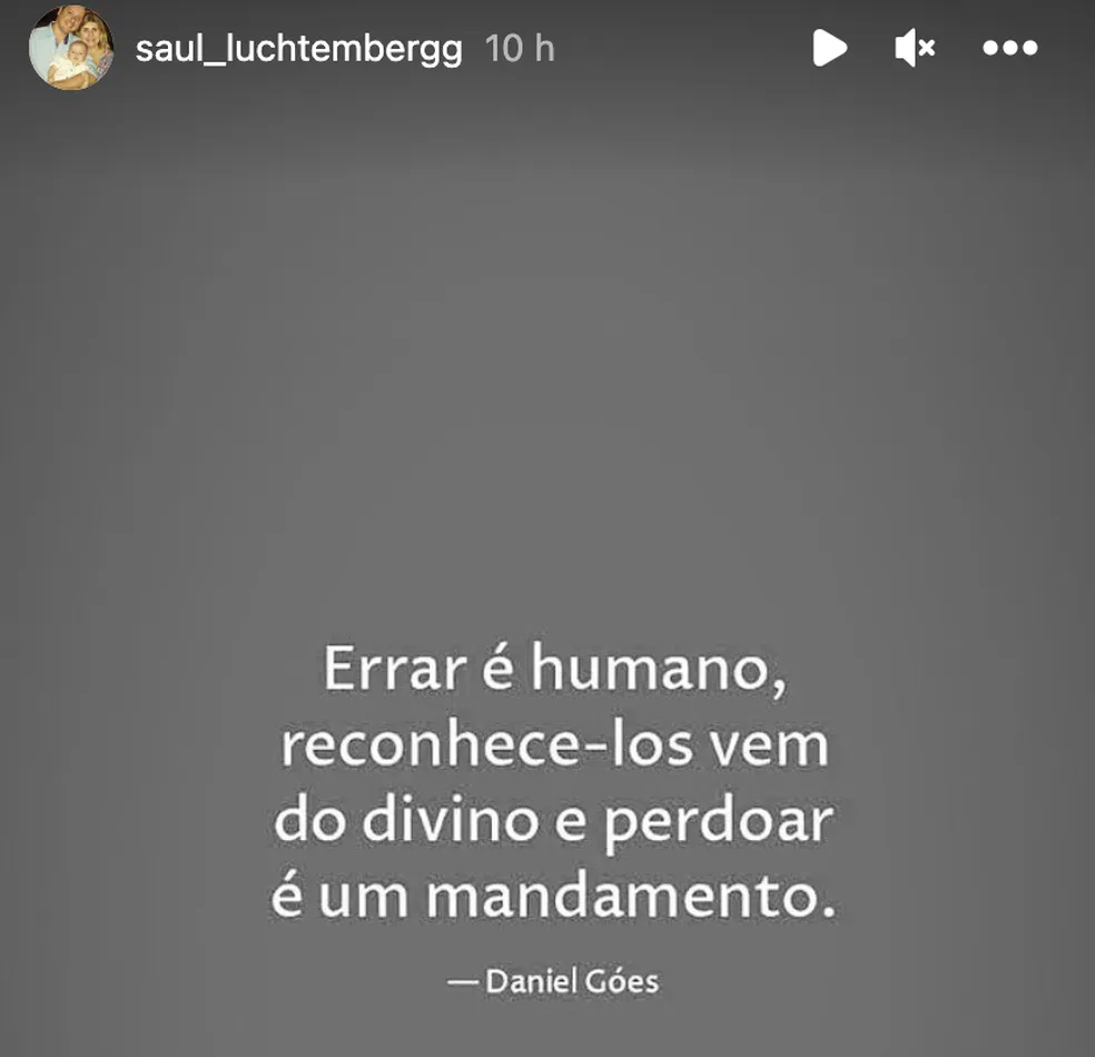 Por fim, em seus stories, Saul agradece por sua família e afirma que errar é humano. “Obrigado Senhor pela minha família. Te agradeço pela minha família e por tua presença no meu lar”. Em outro, ele citou: “Errar é humano, reconhecer [os erros] vem do divino e perdoar é um mandamento”.