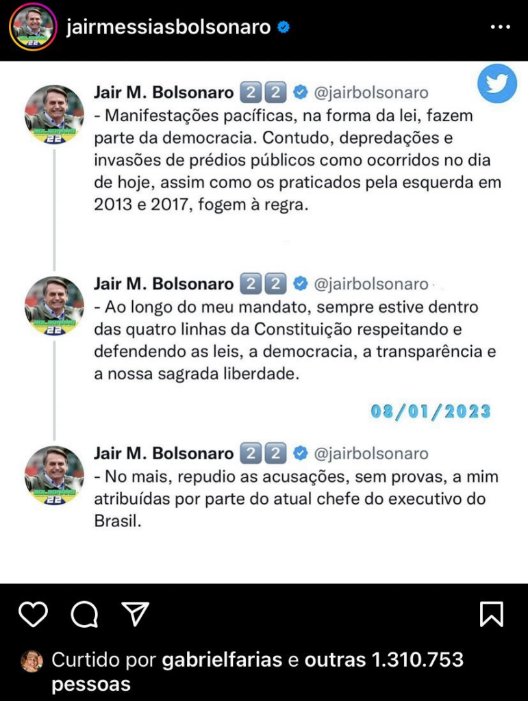Na publicação, Bolsonaro diz que as depredações e invasões fogem à regra da democracia.