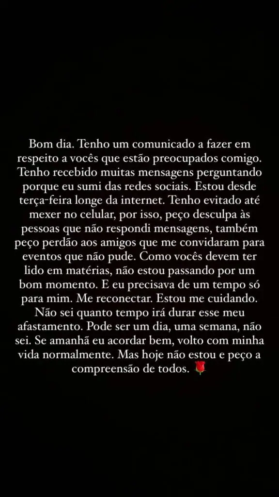 A modelo pediu empatia aos internautas e compreensão por ficar esse tempo afastada: “E eu precisava de um tempo só para mim. Me reconectar. Estou cuidando da minha saúde mental. Não sei quanto tempo irá durar esse meu afastamento. Pode ser um dia, uma semana, não sei. Se amanhã eu acordar bem, volto com minha vida normalmente. Mas hoje não estou e peço a compreensão de todos”.