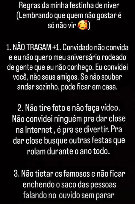 “E tem gente que fala mal porque eu ponho as regras da festa nos stories… A quantidade de mensagem que eu recebi ‘ah, meu namorado, ah, meu marido’. Gente, vão fazer terapia. Não sabe andar sozinho, fica em casa ou vai fazer terapia. Isso porque eu mando a mensagem falando, o povo já sabe que eu sou meio grossa, também [pelo] meu histórico, e as pessoas ainda são sem noção. Não pode! Não pode levar noivo, não pode levar marido, não pode levar ninguém”, iniciou a cantora.