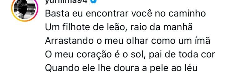 “Basta eu encontrar você no caminho. Um filho de leão, raio da manhã, arrastando o meu olhar como um ímã. O meu coração é o sol, pai de toda a cor, quando ele lhe doura a pele ao léu”, escreveu o jogador.