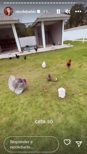 “Olha como o peru está bonito, abriu as asas. Está querendo ‘se aparecer’ para as galinhas. Filho, como é que você está danado já. Olha como ele é a cara do Carmo Dalla Vecchia. Eu acho que ele parece com o Carmo Dalla Vecchia. Ele é muito bonito. Eu acho que ele está paquerando o galo, porque está na reta dele”, comparou a modelo.