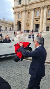 Enquanto o Papa andava pelo Vaticano em seu Papamóvel e era acompanhado por alguns fiéis, o brasileiro achou uma ótima oportunidade para entregar o presente para o Líder religioso. Ao pegar o “manto carioca” o Papa deu um belo e leve sorriso para obrasileiro.