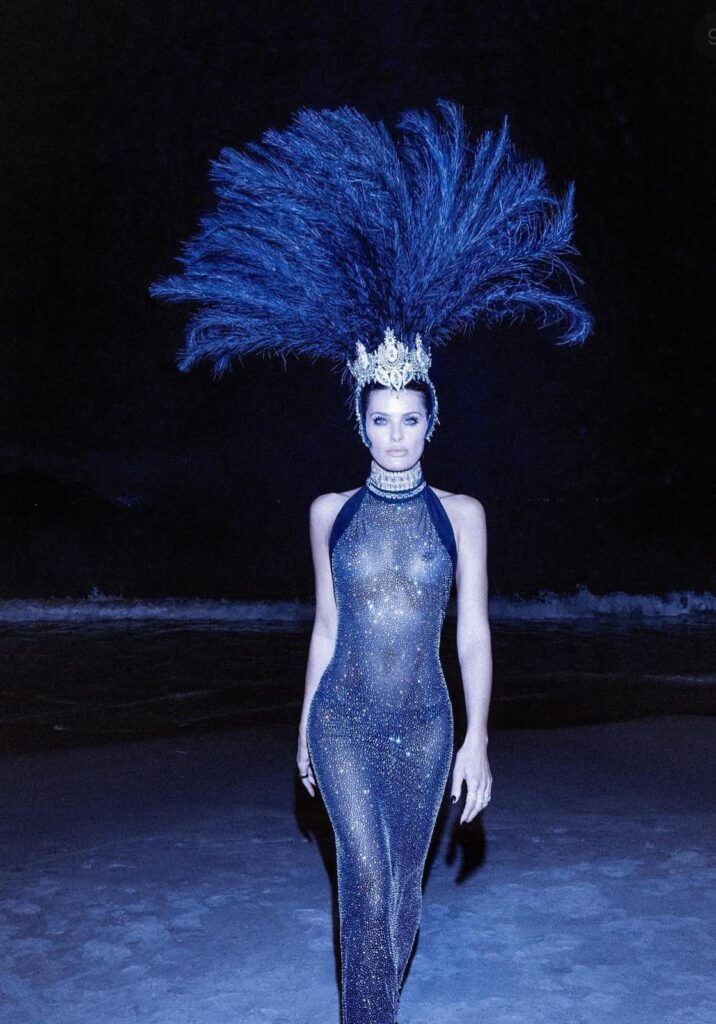 Clássico caso de top model que sabe usar o próprio corpo como suporte de fantasia. Vestido tubo de brilho escuro, gola alta, recorte preciso e uma cabeleira de plumas que resolve o Carnaval sozinha, sem esforço aparente. A elegância está no contraste, e isso Isabeli domina como poucas. Silhueta limpa embaixo, exagero concentrado na cabeça e nos acessórios. É fantasia de quem quer dançar, beber, atravessar a noite inteira e ainda sair linda em todas as fotos. Zero erro. Zero surpresa. E, às vezes, tudo bem.