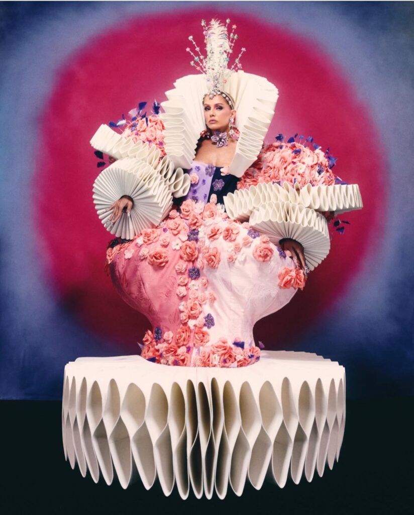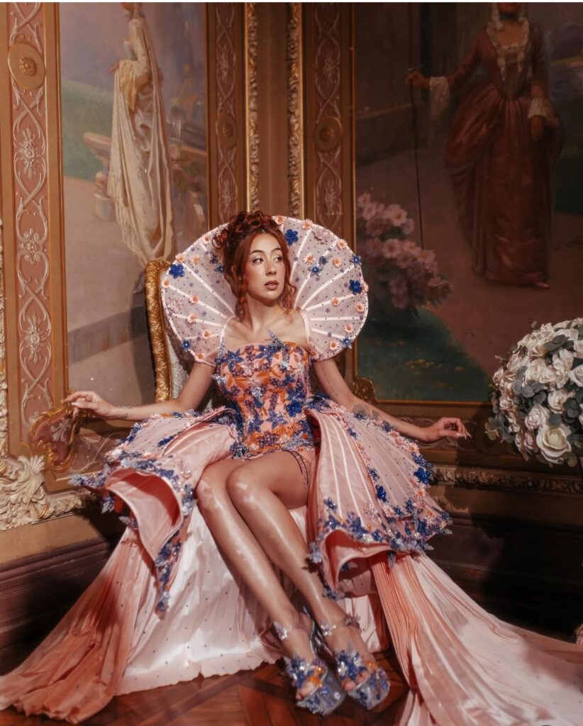 Rosa pálido quase porcelana, aplicações azuis e laranjas e uma estrutura que trabalha o drama com método. Gola em leque, sobressaia armada revelando as pernas e cauda fluida que transforma o cenário inteiro em extensão do vestido. A pose no ambiente clássico fecha a narrativa. Realeza francesa encontra debutante de Carnaval, com acabamento de fantasia de luxo. Poderia escorregar fácil para figurino infantil. Não escorrega, porque a construção sabe exatamente onde colocar o corpo.