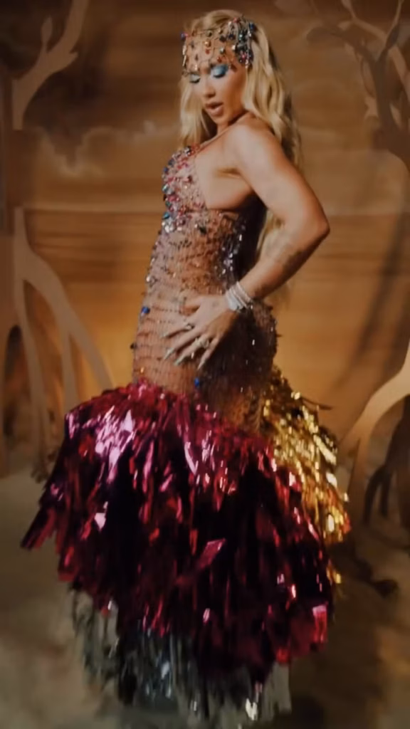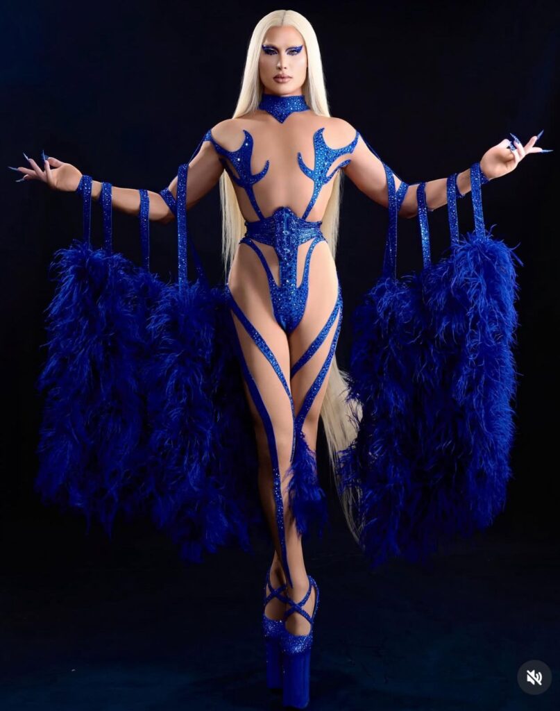 Aqui o Baile vira palco, e ninguém pediu licença. Quase só corpo, preso por tiras azuis, plumas laterais e um cabelo que vira figurino junto. Diva futurista misturada com passista cyberpunk, tudo ao mesmo tempo agora. Funciona porque assume o exagero sem pedir desculpa, sem explicar conceito, sem legenda longa. A linha do vulgar existe, claro que existe, mas ela atravessa com segurança. É daqueles looks impossíveis de ignorar. Ame ou odeie, você viu.