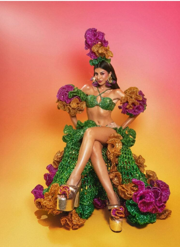 Uma fanfic tropicalista em versão filtro de Instagram, e isso é um elogio. Top e saia verdes, babados glitterizados em roxo e dourado, formando uma fruteira psicodélica ambulante. A fantasia é pensada para imagem parada e para vídeo, e isso é inteligência de era digital. Sentada, com pernas em evidência, plataforma dourada gigante e turbante de babados, vira pôster instantâneo de feed. É exagero assumido, tropicalismo over, mas com construção inteligente de corpo. Nada aqui é tímido. Ingênuo, menos ainda.