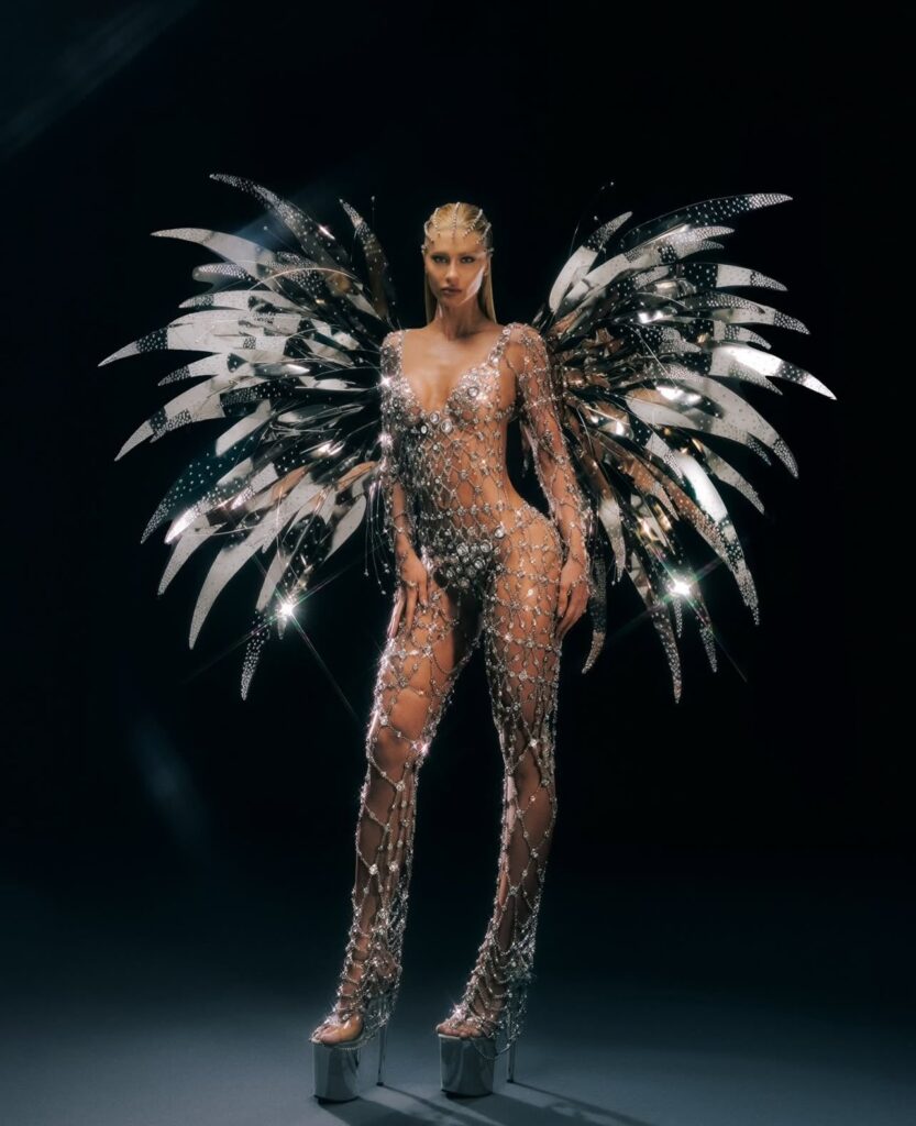 Macacão cravejado de pedraria, transparência calculada e recortes que desenham o corpo como se fosse uma rede de cristal. As asas metálicas explodem em reflexos a cada flash, cada ângulo entrega uma leitura diferente. O efeito é holográfico, quase transmissão do futuro. Não foi feito para a vida real, nem tenta. Foi feito para palco, foto e vídeo. No Baile da Vogue, vamos ser honestos, é exatamente isso que importa.