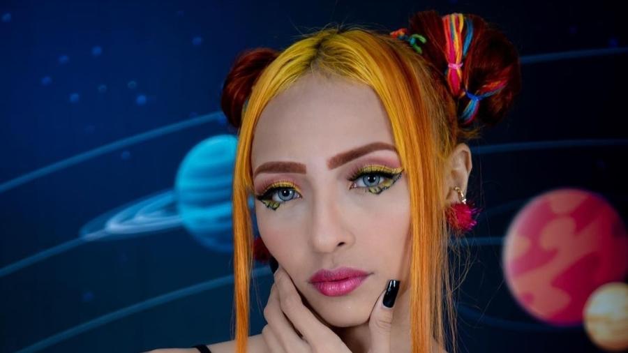 Kátia Flávia Luisa Mell, a “Mística da COP30”, pinta o corpo de planeta Terra e protesta contra cardápio “carnívoro” do evento