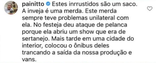 “Esses enrustidos são um saco. A inveja é uma merda. Este merda sempre teve problema unilateral com ela. No festeja deu ataque de pelanca porque ela abriu um show que era de sertanejo. Mais tarde, em uma cidade do interior, colocou o ônibus deles trancando a saída da nossa produção e vans”, disse o pai da carioca.