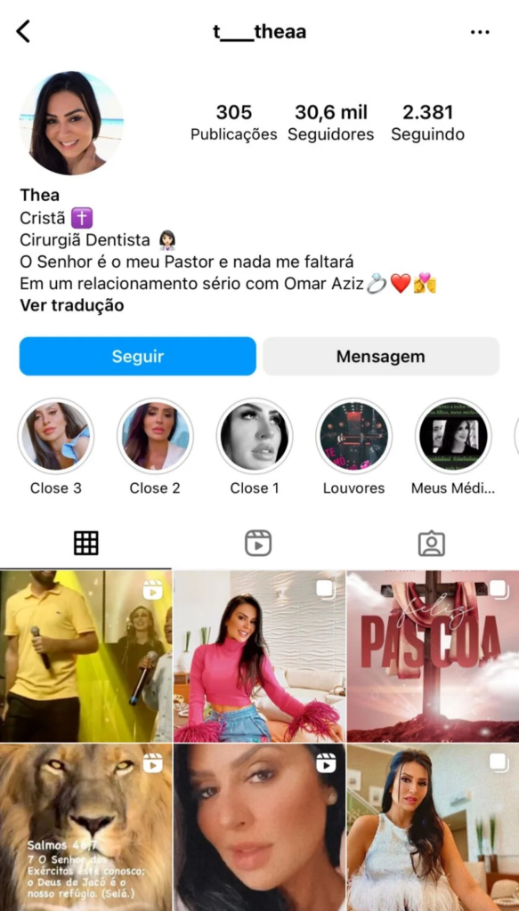 A pastora revelou o romance através da biografia de seu instagram, onde, logo abaixo do famoso versículo bíblico “O Senhor é meu Pastor e nada me faltará” ela colocou a seguinte descrição: “Em um relacionamento sério com Omar Aziz”, seguida de três emojis.
