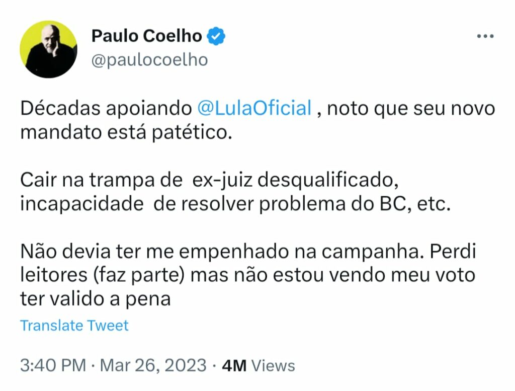 Segundo Villa, Paulo Coelho está muito ansioso. “Parece que ele está assistindo seu time jogar tem 15 minutos e já quer que o time vença”, compara. A declaração polêmica de Paulo foi a seguinte: “Décadas apoiando o Lula, noto que seu novo mandato está patético. Não devia ter feito campanha. Perdi leitores (faz parte), mas não estou vendo meu voto ter valido a pena”, escreveu em sua conta oficial no Twitter.