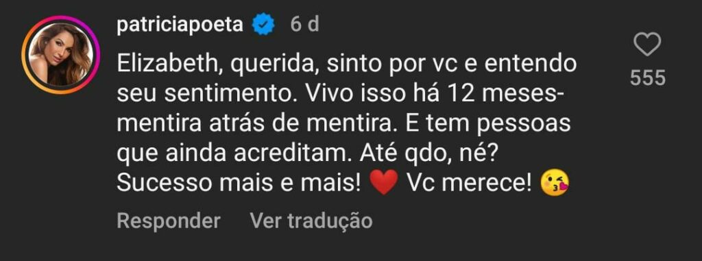 “Elizabeth, querida, sinto por você e entendo seu sentimento. Vivo isso há 12 meses — mentira atrás de mentira. E tem pessoas que ainda acreditam. Até quando, né? Sucesso mais e mais! Você merece!”, comentou Patrícia, que teve o seu comentário respondido por Lo-Bianco.