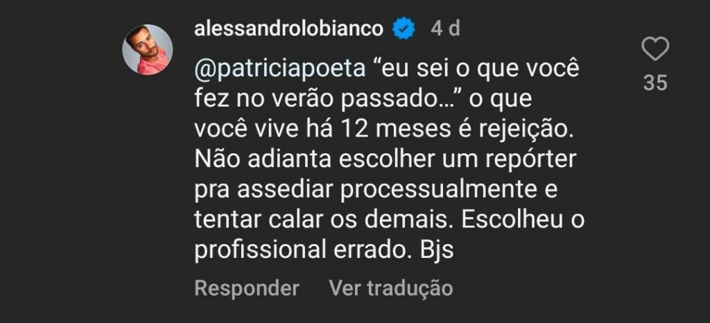 “Muito embora tenha conhecimento do ajuizamento da presente ação, [Lo-Bianco] continua perseguindo e assediando ferozmente [Patrícia Poeta], ora inventando fatos jamais existentes, ora simplesmente comentando postagens por ela realizadas em páginas de terceiras pessoas”, diz o documento, o qual o site ‘Splash’ teve acesso.