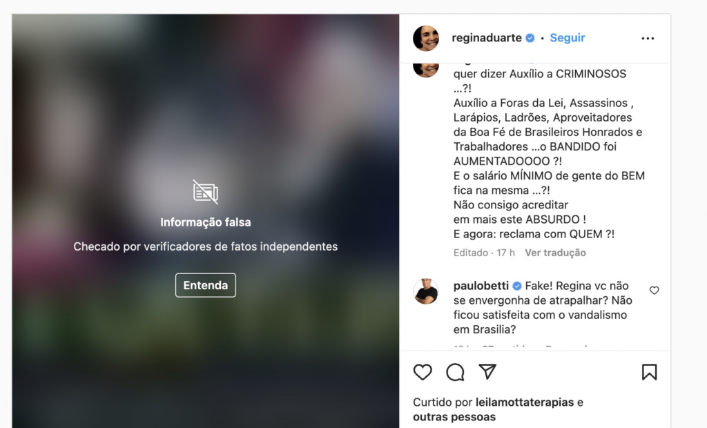 Ao ver que Regina havia compartilhado em suas redes sociais, uma fake news envolvendo um possível aumento no valor do auxílio-reclusão, benefício governamental que é concedido a presidiários, Paulo perdeu a paciência e respondeu o post da atriz.