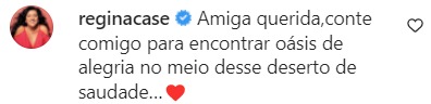 “Amiga querida, conte comigo para encontrar oásis de alegria no meio desse deserto de saudade…”, escreveu a apresentadora Regina Casé.