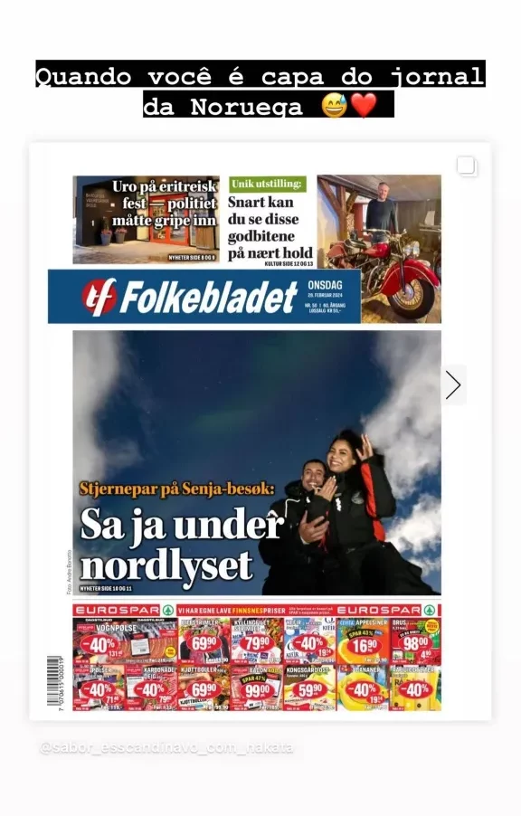 O pedido, inclusive, acabou virando manchete de um jornal local, conforme contou a cantora em seus stories no Instagram. “Disse sim sob as luzes do norte”, diz a tradução na capa do veículo “Folkebladet”.