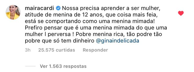 A página Gina Indelicada (@ginaindelicada), no Instagram, postou um vídeo onde Jade assume que fez de propósito por pirraça para iludir que o chamaria ao VIP. Maira se revoltou e comentou: “Nossa precisa aprender a ser mulher. Atitude de menina de 12 anos. Que coisa mais feia. Está se comportando como uma menina mimada! Prefiro pensar que é uma menina mimada do que uma mulher perversa! Pobre menina rica, tão podre tão pobre que só tem dinheiro”, disparou.