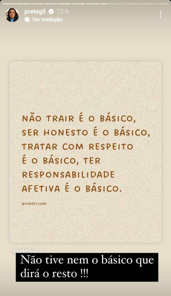 Diante disso, através de seus stories, na madrugada desta quarta-feira (26), Preta, que ainda está muito machucada, principalmente porque tudo aconteceu quando ela estava no início de seu tratamento contra um câncer no intestino, compartilhou uma publicação que falava sobre o mínimo que deve existir em um relacionamento, como forma de alfinetar o ex-marido.