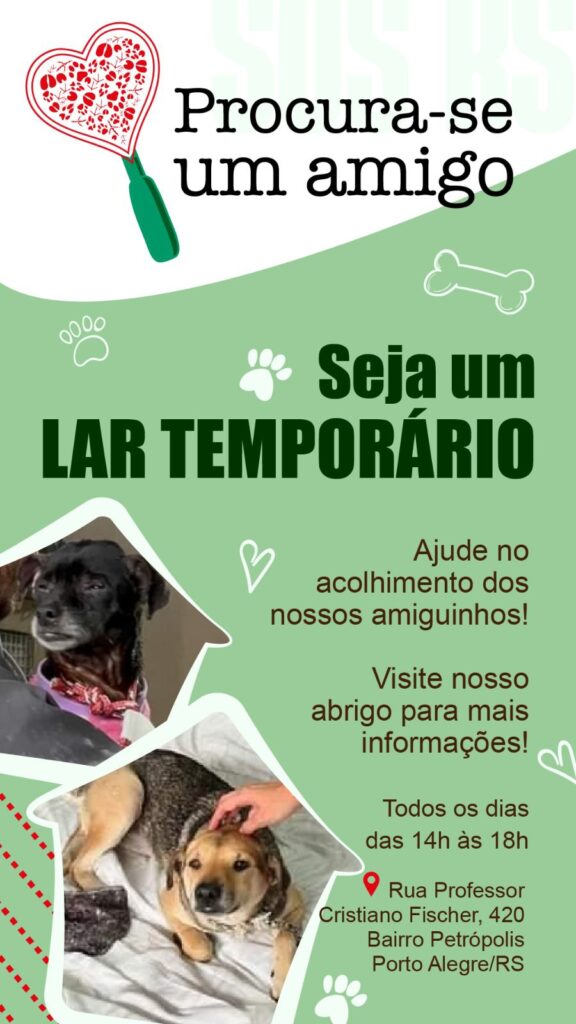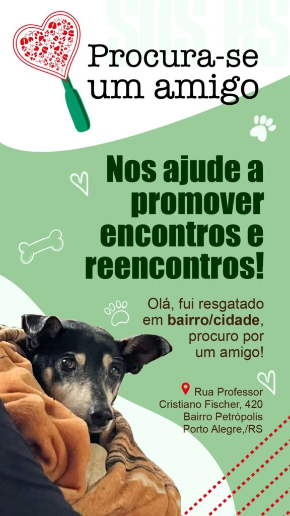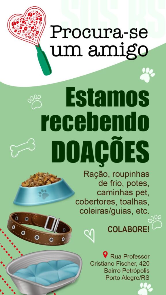 Voluntários, doações de ração e interessados em oferecer lar temporário para os animais devem entrar em contato com o projeto pelo Instagram @procuraseumamigo_rs ou diretamente no galpão de Porto Alegre, localizado na Rua Professor Cristiano Fischer, nº 420.