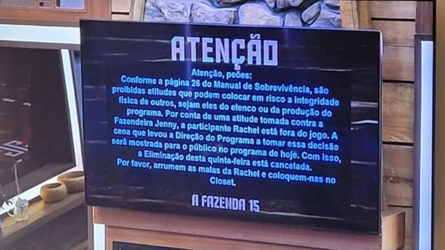 “Conforme a página 26 do Manual de Sobrevivência, são proibidas atitudes que podem colocar em risco a integridade física de outros, sejam eles do elenco ou da produção do programa. Por conta de uma atitude tomada contra a Fazendeira Jenny, a participante Rachel está fora do jogo. A cena que levou a direção do programa a tomar essa decisão será mostrada para o público no programa de hoje. Com isso, a eliminação desta quinta-feira está cancelada. Por favor, arrumem as malas da Rachel e coloquem-nas no closet.”