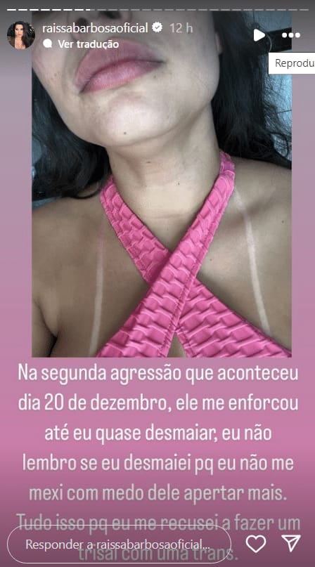 Em uma série de vídeos e imagens nos stories, Raissa contou que temeu pela própria vida: “Ano passado, tive um relacionamento com uma pessoa que me agrediu fisicamente e psicologicamente. Demorei a falar sobre isso por vergonha e tentativas de resolver sem exposição.”