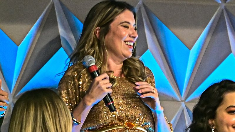 Então, a comunicadora escolheu a convidada que estava usando um look azul. Depois da revelação, ela abraçou seu esposo, que saiu da plateia e foi até ela celebrar o momento especial com o público do SBT.