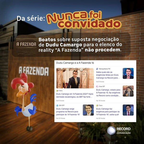 “Boatos sobre suposta negociação de Dudu Camargo para o elenco do reality ‘A Fazenda’ não procede “, inicia a nota. “Da série: Nunca foi convidado… Muito foi falado, mas a verdade é que o jornalista Dudu Camargo nunca foi convidado para nenhuma edição de A Fazenda e não estará na ‘A Fazenda 16’“, informou a Comunicação da emissora pelas redes sociais.