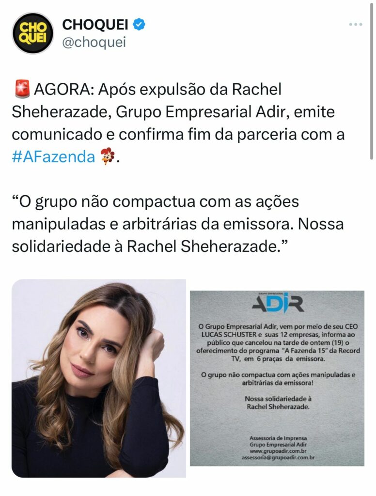 “O Grupo Empresarial Adir, vem por meio de seu CEO Lucas Schuster e suas 12 empresas, informa ao público que cancelou na tarde de ontem (19) o oferecimento do programa “A Fazenda 15” da Record TV, em 6 praças da emissora. O grupo não compactua com ações manipuladas e arbitrárias da emissora! Nossa solidariedade à Rachel Sheherazade”, declarou o comunicado.