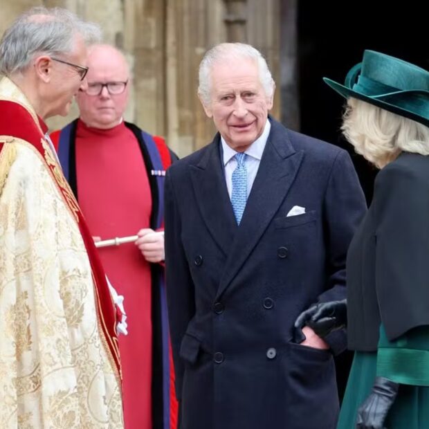 Charles chegou de carro à Capela de São Jorge, no Castelo de Windsor ao lado da Rainha Camila, para o culto de Páscoa. Eles estavam sorridentes e acenaram para as pessoas que os esperavam.