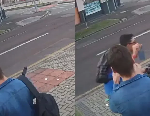 Com o equipamento que portava, o repórter ameaçou bater no criminoso. Ele, assustado, recua, pega a bicicleta e foge.