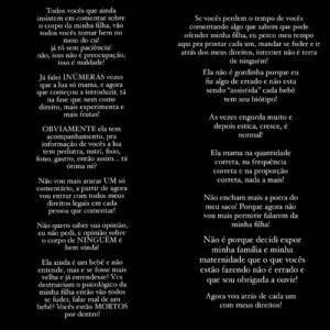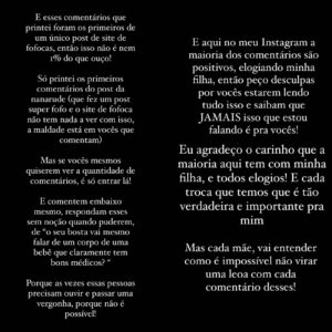 “Não vou mais aturar um só comentário. A partir de agora, vou entrar com todos os meus direitos legais em cada pessoa que comentar. Não quero saber sua opinião, eu não pedi e opinião sobre o corpo de ninguém é bem-vinda. Ela ainda é uma bebê, mas e se fosse mais velha e já entendesse? Vocês destruiriam o psicológico da minha filha. Falar mal de um bebê? Vocês estão mortos por dentro”, disparou.