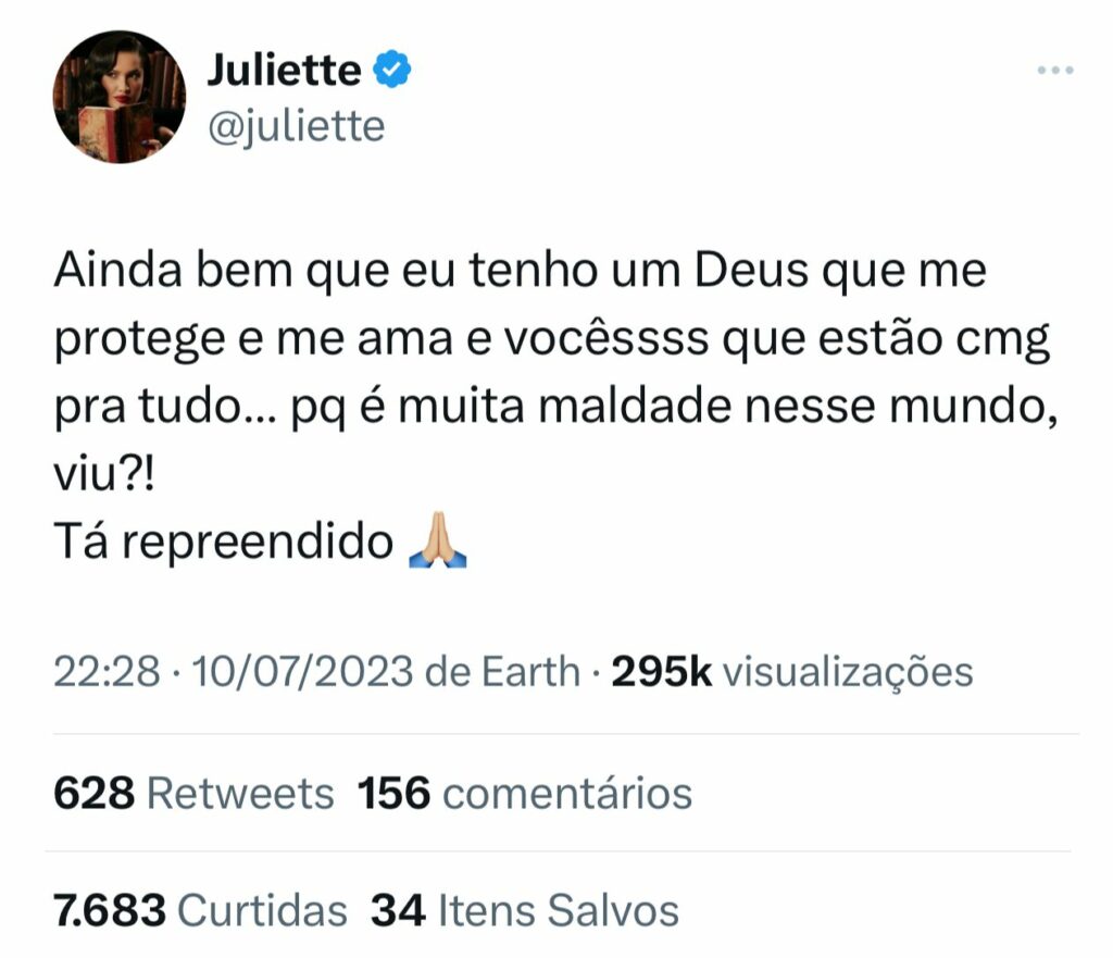 Em contrapartida, após a exibição do “Link Podcast”, através de seu twitter, Juliette agradece por ter Deus e os fãs ao seu lado, afirmando que o mundo está cheio de maldade.