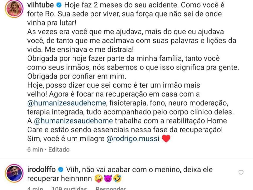 Na legenda, Viih escreveu: “Hoje faz 2 meses do seu acidente. Como você é forte, Rô. Sua sede por viver, sua força que não sei de onde vinha pra lutar! Às vezes era você que me ajudava, mais do que eu ajudava você, de tanto que me acalmava com suas palavras e lições da vida. Me ensinava e me distraia! Obrigada por hoje fazer parte da minha família, tanto você como seus irmãos, nós sabemos o que isso significa pra gente. Obrigada por confiar em mim. Hoje, posso dizer que sei como é ter um irmão mais velho! Agora é focar na recuperação em casa (…) Sim, você é um milagre @rodrigo.mussi”.