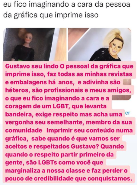 O comentário tinha relação com os produtos, como cadernos e canecas, que são vendidos com o rosto do apresentador estampado. Por sua vez, Rodrigo não deixou barato e a conta veio bem cara pelo seu Instagram para rebater o comentário preconceituoso vindo de uma pessoa da comunidade LGBTQIA+. Confira: