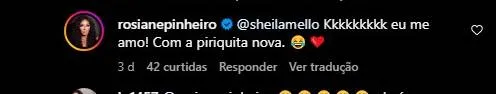 “Aumentar a piriquita???? Oxi, mulher! (risos) Vá se cuidar, se amar!!!”, comentou Sheila no post onde a dançarina mostra parte de sua recuperação. Rosiane então comenta que está muito feliz com a sua região íntima nova: “Eu me amo! Com a piriquita nova”.