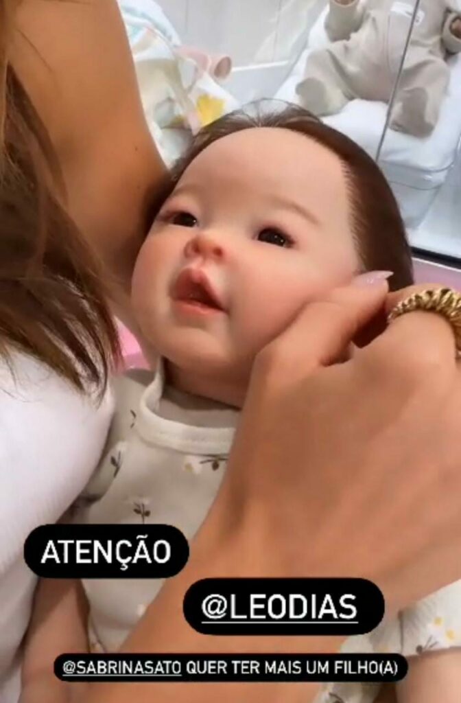 Enquanto segurava uma daquelas bonecas extremamente realistas, Sabrina e Rodrigo a compararam com a Zoe, filha da apresentadora com o seu ex-marido, o ator Duda Nagle, e, com isso, o empresário resolveu perguntar se ela tinha a vontade de ter outro filho e a resposta de Sabrina surpreendeu tanto o Rodrigo que até brincou criando uma manchete para os jornalistas noticiarem a revelação da modelo.