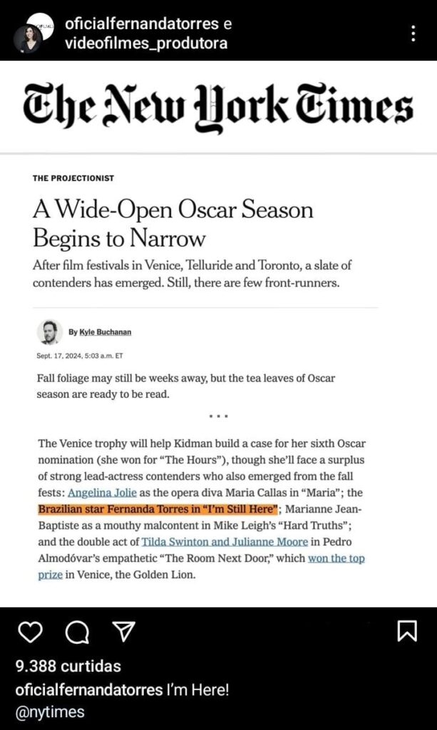 Buchanan observou que Fernanda é uma séria ameaça ao favoritismo de Nicole Kidman, vencedora do prêmio de Melhor Atriz em Veneza por “Babygirl”. Embora Kidman tenha um forte apoio para sua sexta indicação ao Oscar, a performance marcante de Fernanda em “Ainda Estou Aqui” a posiciona como uma concorrente de peso.