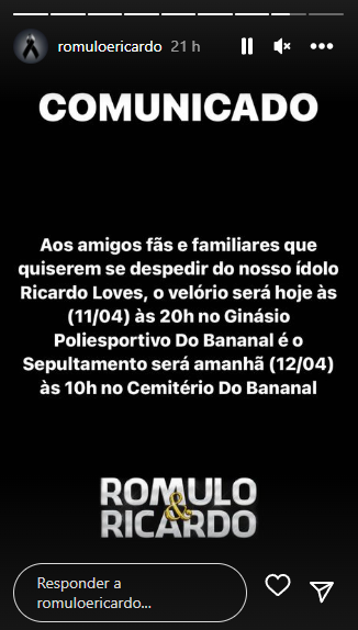 De acordo com a assessoria da dupla, o corpo de Ricardo foi velado desde às 22h de ontem (11) às 10h de hoje (12), no Ginásio Poliesportivo, no bairro do Bananal, sendo enterrado no Cemitério de Guapimirim.