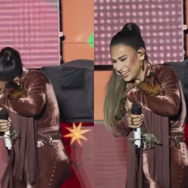 No final da música, a famosa pediu para o público aplaudir sua galinha. Em seguida, ela pediu para que sua equipe levasse o animal para seu camarim e cuidasse dele enquanto ela seguia com a apresentação. “Deixa a bichinha solta”, orientou.