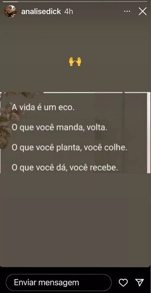 “ A vida é um eco. O que você manda, volta. O que você planta, você colhe. O que você dá, recebe”, escreveu a mãe de Cintia e logo depois, notaram que ela não segue mais o genro nas redes sociais.