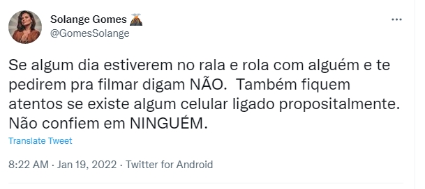 Sol publicou a seguinte mensagem: “Se algum dia estiverem no rala e rola com alguém e te pedirem pra filmar digam NÃO. Também fiquem atentos se existe algum celular ligado propositalmente. Não confiem em NINGUÉM.”