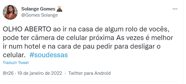Mas ela não parou por aí: “OLHO ABERTO ao ir na casa de algum rolo de vocês, pode ter câmera de celular próxima As vezes é melhor ir num hotel e na cara de pau pedir para desligar o celular.”