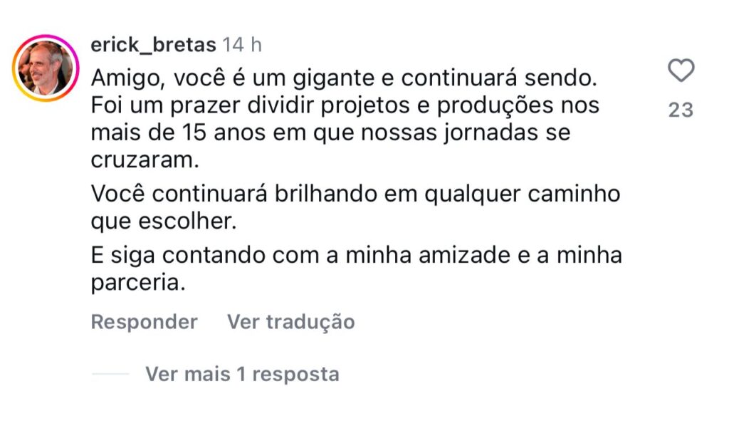 Inúmeros famosos e demais emissoras de Tv lamentam a saída dele e desejaram boa sorte ao executivo, o Erick Bretas, ex-CEO da GloboPlay que trabalhou com Boninho em vários projetos e produções das emissoras durante 15 anos deixou uma mensagem emocionante na publicação do executivo.