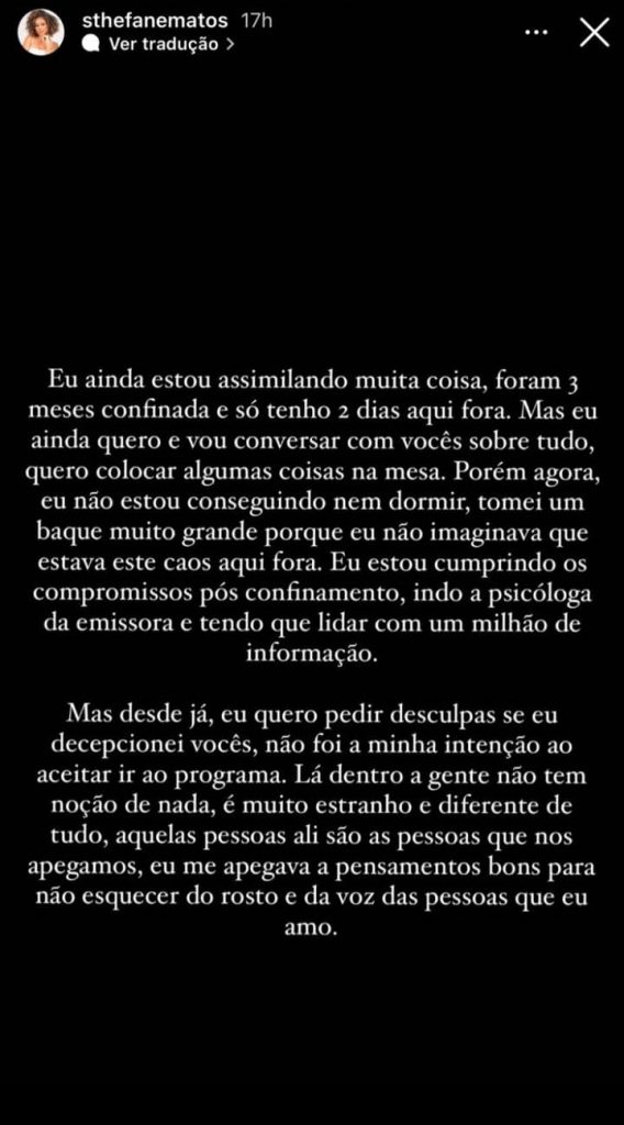 Sthefane postou em seus stories uma carta aberta aos fãs e também a Mirela. Em um trecho ela ressaltou: Nesse momento eu queria vir a público pedir desculpa a companheira do meu ex colega de confinamento, porque eu como mulher me colocando no lugar de outra mulher não gostaria de passar pelo mesmo. Nunca foi minha intenção magoar ou ferir o relacionamento de uma outra mulher. Por isso, Mirela, espero de coração que aceite minhas desculpas.”