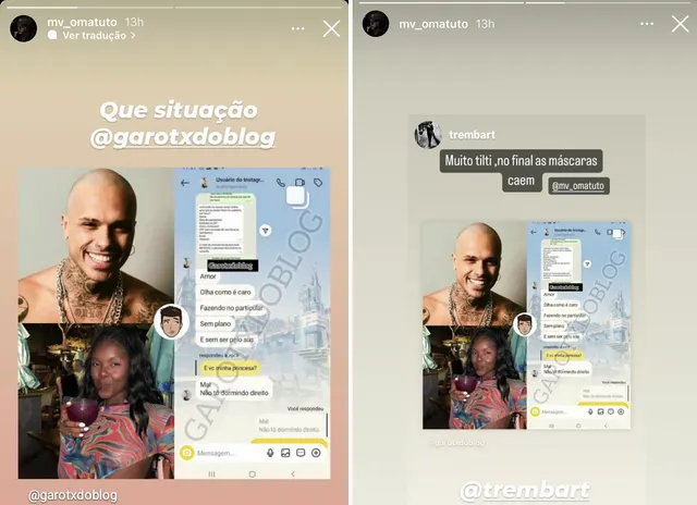 Ao contrário da modelo, que até o momento não se pronunciou sobre o assunto, Matuto compartilhou a publicação dos prints em seus stories e legendou: “Que situação. As máscaras caem”.