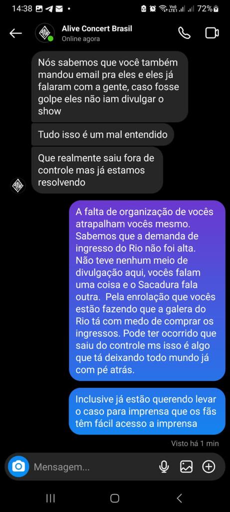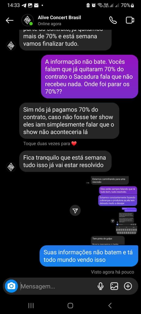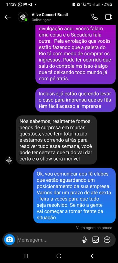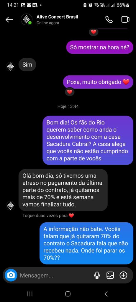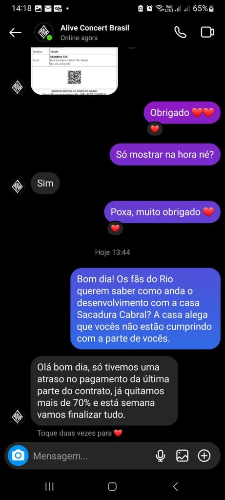 Outros fãs também procuraram a Casa Sacadura no Rio, que disseram que o contrato até foi assinado , mas não houve nenhum pagamento por parte da produtora e que vão recorrer judicialmente a empresa pela falta de pagamento, como podemos vemos nos prints abaixo.
