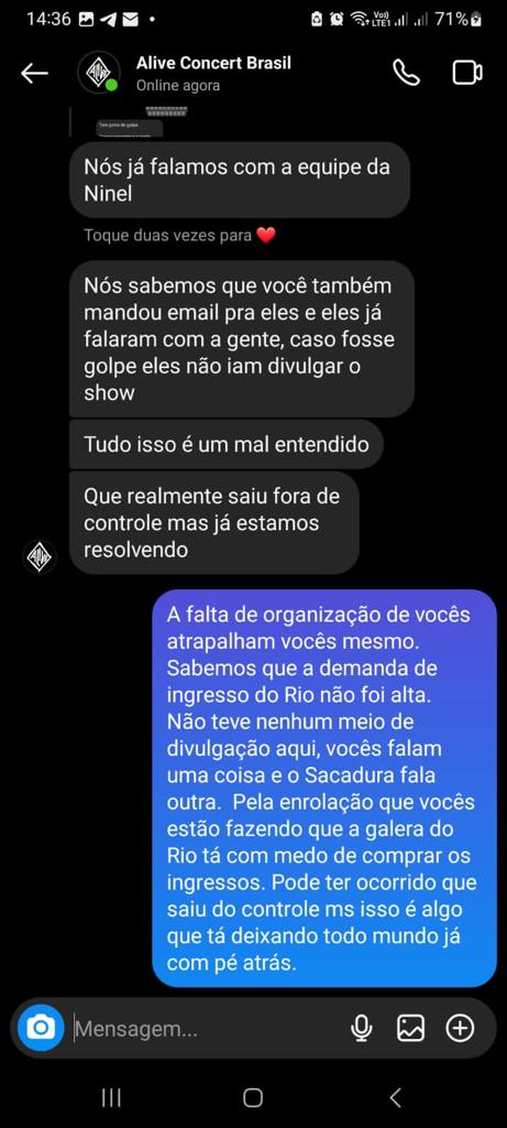 Só que o buraco é bem mais em baixo, tá okay? Tá começando a circular um boato de que era golpe, já essa mesma empresa já tinha dado golpe em outro evento anteriormente. Então, com um pé atrás, no Rio de Janeiro, o pessoal consegui devolver todos os ingressos , mas infelizmente em São Paulo, não conseguiram fazer o mesmo.