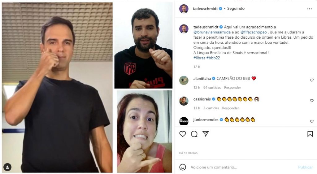 Em seu Instagram (@tadeuschmidt), o apresentador postou um print de sua “aula” e legendou: “Aqui vai um agradecimento a @brunaviannaarruda e ao @fifacachopao, que me ajudaram a fazer a penúltima frase do discurso de ontem em Libras. Um pedido em cima da hora, atendido com a maior boa vontade! Obrigado, queridos!!! A Língua Brasileira de Sinais é sensacional!”. Arrancando palmas e parabenizações em diversos comentários.